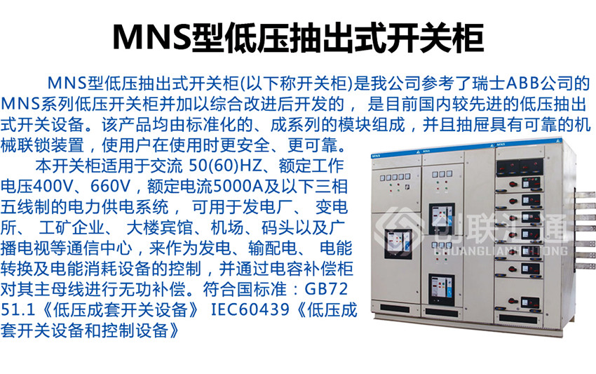 MNS型低壓抽出式開關(guān)柜適用于發(fā)電廠、變電站、石油化工、冶金軋鋼、輕工紡織等廠礦企業(yè)和住宅小區(qū)、高層建筑等場所,作為交流50~60Hz,額定工作電壓交流660V及以下的電力系統(tǒng)的配電設(shè)備的電能轉(zhuǎn)換、分配及控制之用。