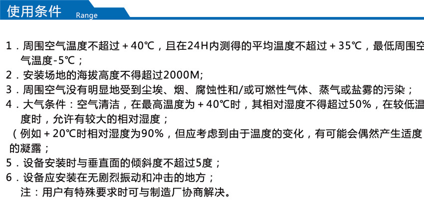 2. 大氣條件:空氣清潔,相對濕度在最高溫度+40℃時(shí)不超過50﹪;在較低溫度時(shí)允許有較高的相對濕度,例如20℃時(shí)為90﹪,但應(yīng)考慮到由于溫度的變化,有可能會(huì)偶然地產(chǎn)生適度的凝露。