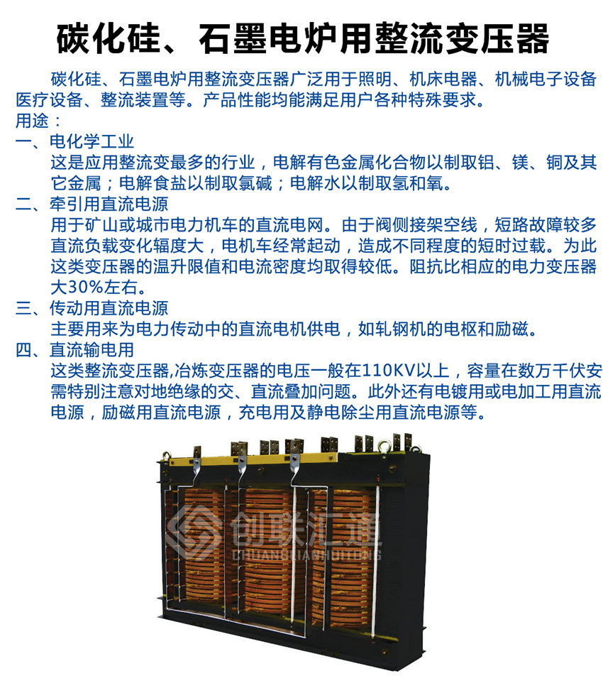 碳化硅、石墨電爐用整流變壓器的電壓一般在110kV以上,容量在數(shù)萬千伏安。需特別注意對地絕緣的交、直流疊加問題。此外還有電鍍用或電加工用直流電源,勵磁用直流電源,充電用及靜電除塵用直流電源等。