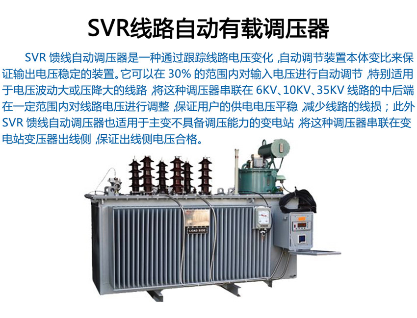 SVR線路自動(dòng)調(diào)壓器工作原理 SVR線路自動(dòng)調(diào)壓器共有三部分構(gòu)成:自耦變壓器、有載分接開關(guān)和自動(dòng)控制器。 自耦變壓器的整個(gè)線圈分為三部分:串勵(lì)線圈、并勵(lì)線圈,控制線圈。其中,串勵(lì)線圈是一個(gè)有多個(gè)抽頭的繞組,這些抽頭通過有載分接開關(guān)的不同接點(diǎn)串聯(lián)在輸入輸出之間,改變分接位置,從而改變自耦變壓器變比,達(dá)到調(diào)整電壓的目的;并勵(lì)線圈為自耦變壓器的公共繞組,產(chǎn)生傳遞能量的磁場; 控制線圈為控制器提供工作電源和采樣信號。 有載分接開關(guān),是可在帶負(fù)載的情況下轉(zhuǎn)換接點(diǎn)的開關(guān)。在自動(dòng)調(diào)壓器中,串聯(lián)繞組的抽頭接在有載分接開關(guān)的不同接點(diǎn)上,可以通過轉(zhuǎn)換接點(diǎn)調(diào)節(jié)變壓器變比來改變其輸出電壓