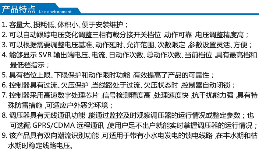 我公司生產(chǎn)的SVR型線路自動(dòng)調(diào)壓變壓器原理是SVR與10kV 柱上無功自動(dòng)補(bǔ)償裝置GWJ配合使用,可有效地解決線路電壓低及無功電源不足的問題。SVR 能有效地調(diào)節(jié)電路電壓, GWJ無功補(bǔ)償裝置能有效補(bǔ)償無功,提高功率因數(shù),降低線損,其效果相當(dāng)于一個(gè)簡易的柱上變電站,而造價(jià)僅為常規(guī)變電站的1/6~1/10。而成本只有變電站的1/6,1/7,而且無需工作人員值班維護(hù)。