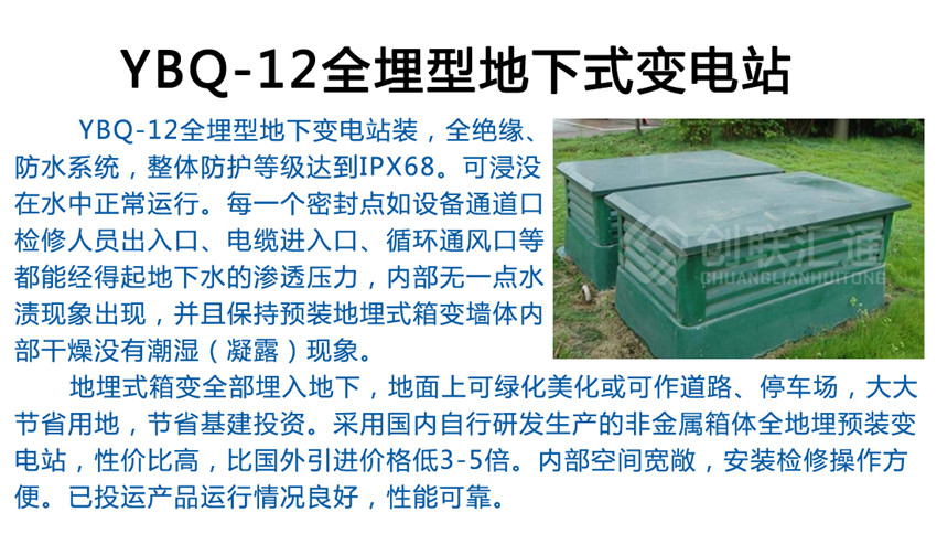 YBDM-12系列地埋箱式變電站(簡(jiǎn)稱地埋式箱變),是在充分研究和探討現(xiàn)代城市建設(shè)和管理的基礎(chǔ)上,新開發(fā)出的新一代箱式變。其主體部分或全部埋入地下,占地很少,甚至不占地,視覺效果非常好,有效解決了城市用地緊張和城市牛皮癬的矛盾,與周邊環(huán)境和諧統(tǒng)一,備受廣大專家和用戶的推崇。地埋箱式變電站是指該箱式變電站的成套裝置全部安裝于一個(gè)全密封的箱體內(nèi)部并把整體設(shè)制于地平面以下,它和地面上箱式變電站,內(nèi)部設(shè)備是相同的,同樣是由10KV輸入電壓經(jīng)變壓器降為400/220V配電電壓再送配至使用負(fù)荷點(diǎn),可用于環(huán)網(wǎng)配電系統(tǒng),也可作為放射式電網(wǎng)終端供電的變電站。這種全地埋型又稱地下變電站,它的箱體具有極好的防腐能力和抗壓能力,并具有絕對(duì)的密封性。
