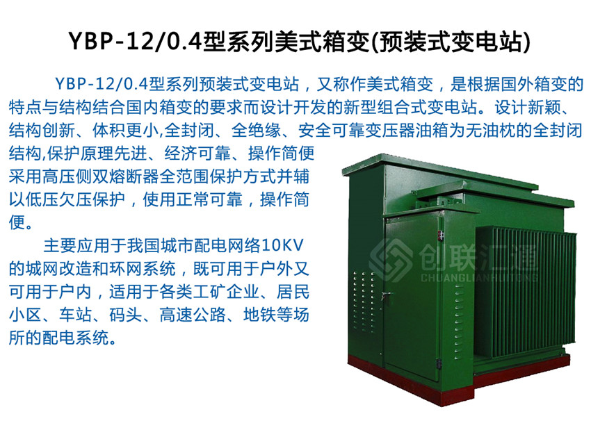 ●YBP-12/0.4型系列預(yù)裝式變電站,又稱作美式箱變,是根據(jù)外箱變的特點與結(jié)構(gòu)結(jié)合內(nèi)箱變的要求而設(shè)計開發(fā)的新型組合式變電站。